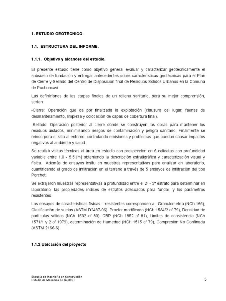 El presente estudio tiene como objetivo general evaluar y caracterizar geotcnicamente el subsuelo de fundacin y entregar antecedentes sobre caractersticas geotcnicas para el Plan de Cierre y Sellado del Centro de Disposicin final de Residuos Slidos Urbanos en la Comuna de Puchuncav. Las definiciones de las etapas finales de un relleno sanitario, para su mejor comprensin, seran: -Cierre: Operacin que da por finalizada la explotacin (clausura del lugar; faenas de desmantelamiento, limpieza y colocacin de capas de cobertura final). -Sellado: Operacin posterior al cierre donde se construyen las obras para mantener los residuos aislados, minimizando riesgos de contaminacin y peligro sanitario. Finalmente se reincorpora el sitio al entorno, controlando emisiones y problemas que puedan causar impactos negativos al ambiente y salud. Se realiz visitas tcnicas al rea en estudio con prospeccin en 6 calicatas con profundidad variable entre 1.0 - 5.5 [m] obteniendo la descripcin estratigrfica y caracterizacin visual y fsica. Adems de ensayos insitu en muestras representativas para analizar en laboratorio, cuantificando el grado de infiltracin en el terreno a travs de 5 ensayos de infiltracin del tipo Porchet. Se extrajeron muestras representativas a profundidad entre el 2 - 3 estrato para determinar en laboratorio: las propiedades ndices de estratos adecuados para fundar, y los parmetros resistentes. Los ensayos de caractersticas fsicas resistentes corresponden a : Granulometra (NCh 165), Clasificacin de suelos (ASTM D2487-06), Proctor modificado (NCh 1534/2 of 79), Densidad de partculas slidas (NCh 1532 of 80), CBR (NCh 1852 of 81), Limites de consistencia (NCh 1571/1 y 2 of 1979), determinacin de Humedad (NCh 1515 of 79), Compresin No Confinada (ASTM 2166-6)