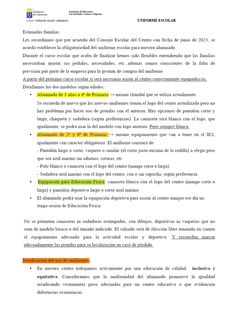 C.E.I.P. “PRÍNCIPE FELIPE” (38000834) UNIFORME ESCOLAR