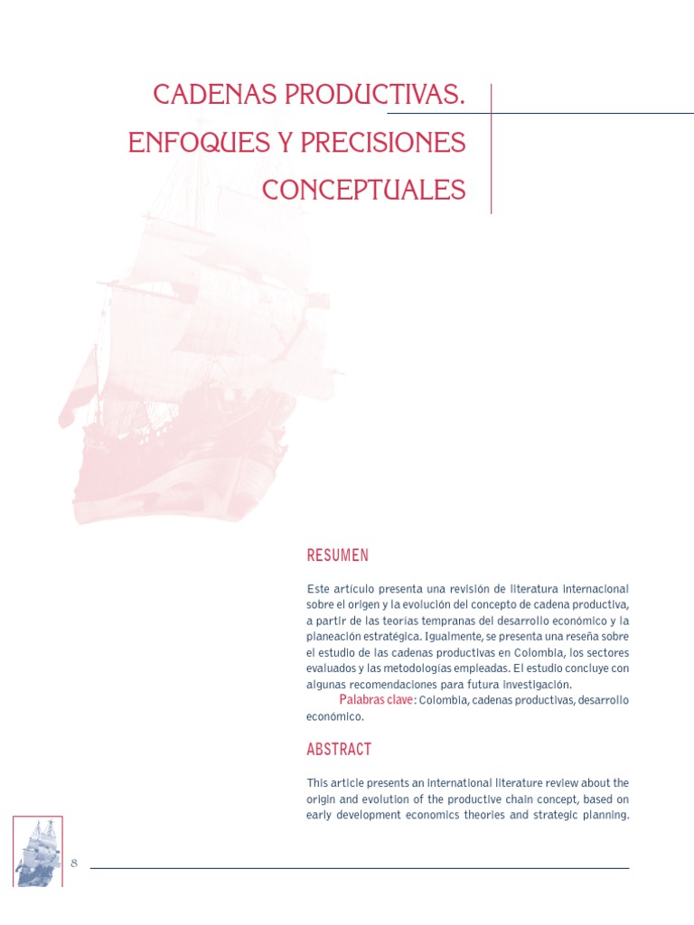 Este artculo presenta una revisin de literatura internacional sobre el origen y la evolucin del concepto de cadena productiva, a partir de las teoras tempranas del desarrollo econmico y la planeacin estratgica. Igualmente, se presenta una resea sobre el estudio de las cadenas productivas en Colombia, los sectores evaluados y las metodologas empleadas. El estudio concluye con algunas recomendaciones para futura investigacin. Palabras clave: Colombia, cadenas productivas, desarrollo econmico.