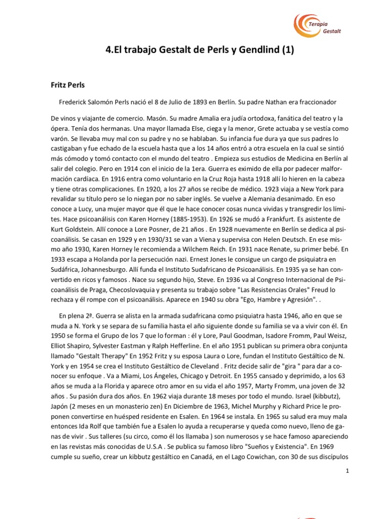 "Yo soy yo, t eres t. No estoy en la vida para responder a tus expectativas y t no ests en la vida para responder a las mas. Si por casualidad nos encontramos, ser hermoso. Si no, cada uno podr seguir en paz su propio camino." F. Perls (1893-1970) fund la Terapia Gestalt a partir de su formacin psicoanaltica, como reaccin a los postulados mecanicistas y de fragmentacin de las instancias y procesos psicolgicos, incorporando las ideas holsticas de la Psicologa de la Gestalt de Wertheimer, as como las formulaciones existencialistas de la psicoterapia de Binswanger. A igual que se ha dicho sobre otros modelos, no sera ste el marco idneo para una presentacin exhaustiva del enfoque de la Gestalterapia. No obstante, entendemos necesaria una exposicin a muy grandes rasgos de los postulados fundamentales de su modelo que sirva de marco de conocimientos desde el que poder ilustrar cuanto de singular tiene esta modalidad psicoteraputica en cuanto al trabajo con los sueos. Perls tuvo un limitado inters terico, prefiriendo siempre centrarse en la prctica clnica. Por tanto, para cualquier presentacin de su modelo hemos de recurrir prioritariamente a sus discpulos ms destacados antes que a los textos del fundador, ms dirigidos a la publica6