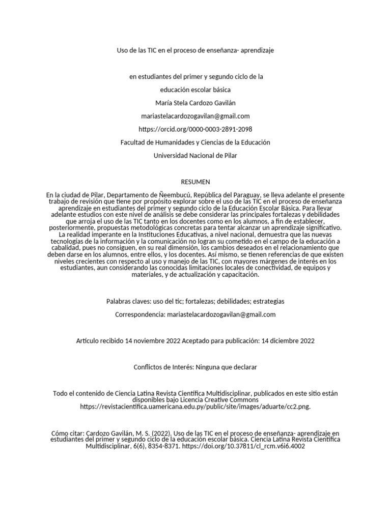 Cómo citar: Cardozo Gavilán, M. S. (2022). Uso de las TIC en el proceso de enseñanza- aprendizaje en