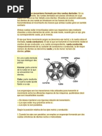 Un engranaje es un elemento mecnico destinado a transmitir el movimiento de rotacin sin deslizar. Dada la dificultad que presenta esa ausencia de deslizamiento en una superficie lisa, los engranajes presentan una superficie dentada, destinada a engranar uno con otro, de modo que ese deslizamiento sea imposible, realizando una transmisin del movimiento exacta.