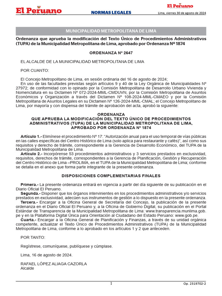NORMAS LEGALES Lima, viernes 30 de agosto de 2024