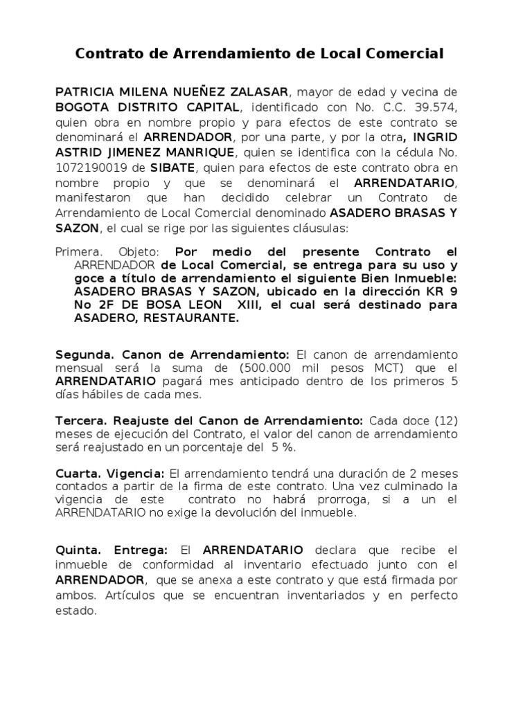 PATRICIA MILENA NUEEZ ZALASAR, mayor de edad y vecina de BOGOTA DISTRITO CAPITAL, identificado con No. C.C. 39.574, quien obra en nombre propio y para efectos de este contrato se denominar el ARRENDADOR, por una parte, y por la otra, INGRID ASTRID JIMENEZ MANRIQUE, quien se identifica con la cdula No. 1072190019 de SIBATE, quien para efectos de este contrato obra en nombre propio y que se denominar el ARRENDATARIO, manifestaron que han decidido celebrar un Contrato de Arrendamiento de Local Comercial denominado ASADERO BRASAS Y SAZON, el cual se rige por las siguientes clusulas: Primera. Objeto: Por medio del presente Contrato el ARRENDADOR de Local Comercial, se entrega para su uso y goce a ttulo de arrendamiento el siguiente Bien Inmueble: ASADERO BRASAS Y SAZON, ubicado en la direccin KR 9 No 2F DE BOSA LEON XIII, el cual ser destinado para ASADERO, RESTAURANTE. Segunda. Canon de Arrendamiento: El canon de arrendamiento mensual ser la suma de (500.000 mil pesos MCT) que el ARRENDATARIO pagar mes anticipado dentro de los primeros 5 das hbiles de cada mes. Tercera. Reajuste del Canon de Arrendamiento: Cada doce (12) meses de ejecucin del Contrato, el valor del canon de arrendamiento ser reajustado en un porcentaje del 5 %. Cuarta. Vigencia: El arrendamiento tendr una duracin de 2 meses contados a partir de la firma de este contrato. Una vez culminado la vigencia de este contrato no habr prorroga, si a un el ARRENDATARIO no exige la devolucin del inmueble. Quinta. Entrega: El ARRENDATARIO declara que recibe el inmueble de conformidad al inventario efectuado junto con el ARRENDADOR, que se anexa a este contrato y que est firmada por ambos. Artculos que se encuentran inventariados y en perfecto estado.