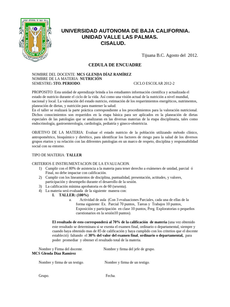 Nombre y Firma del docente. Nombre y firma del jefe de grupo.