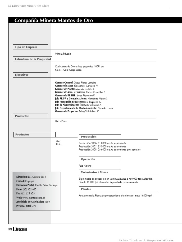Direccin: Los Carrera 6651 Ciudad: Copiap Direccin Postal: Casilla 246 - Copiap Fono: (52) 523 400 Fax: (52) 523 425 Web: www.mantosdeoro.cl Ao inicio de Actividades: 1989 Personal total: 470