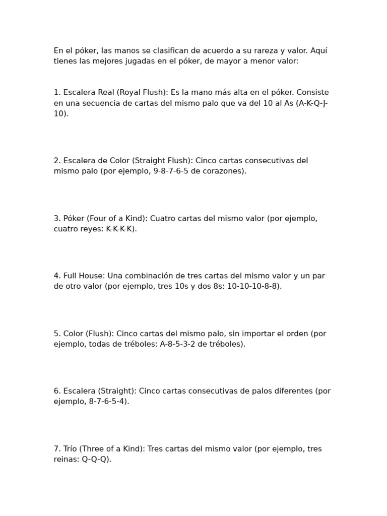 tienes las mejores jugadas en el póker, de mayor a menor valor: