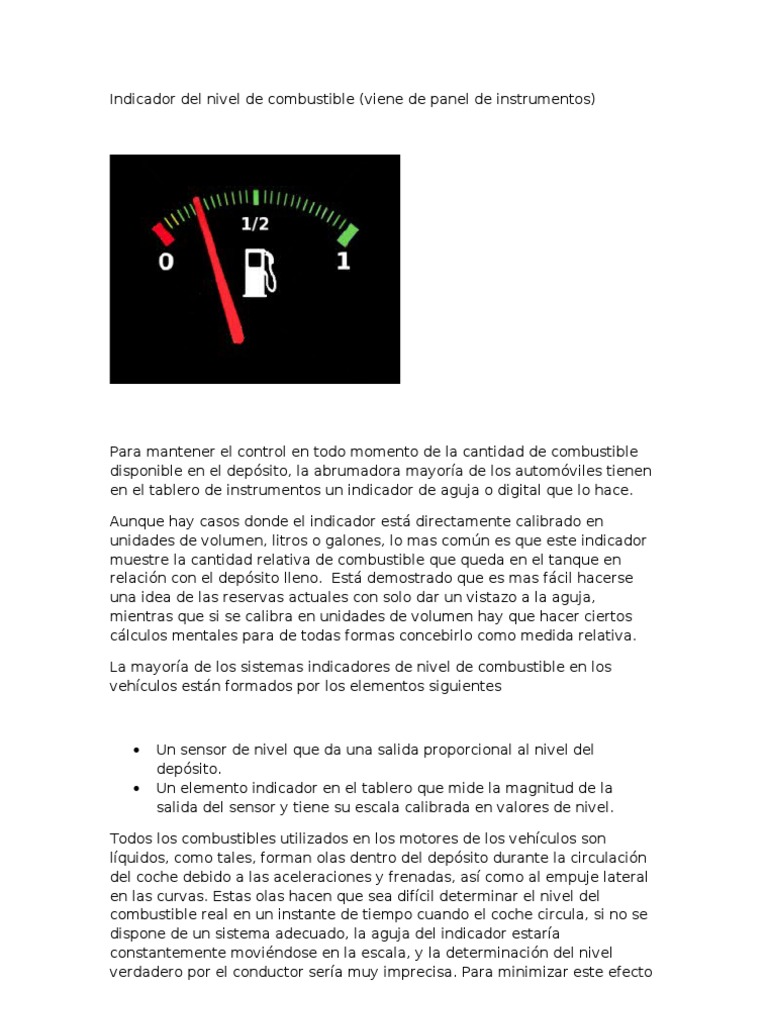 Un sensor de nivel que da una salida proporcional al nivel del depsito. Un elemento indicador en el tablero que mide la magnitud de la salida del sensor y tiene su escala calibrada en valores de nivel.