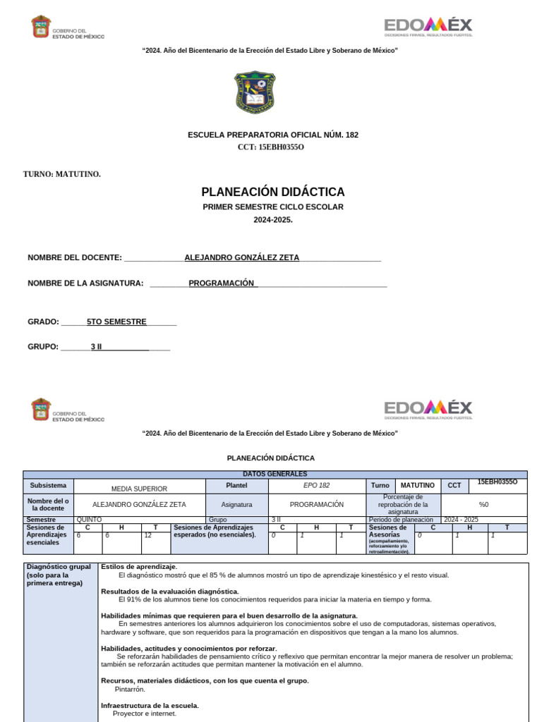 *En el apartado de sesiones de aprendizajes esenciales y esperados, C=Conocimientos, H=Habilidades y T=la suma de C y H
