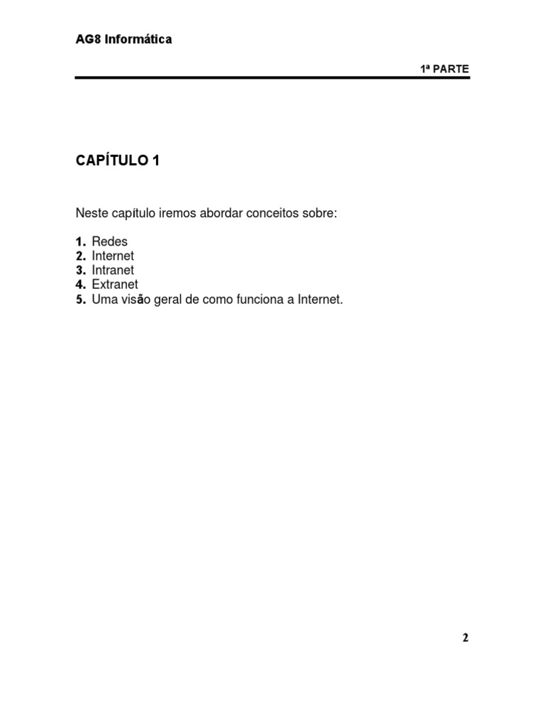 De forma simples e concisa mostre como funciona. 2. C. Se estiver trabalhando em uma Intranet em uma empresa poderá ter acesso a Internet? 7. O que uma Extranet? ANOTAÇÕES 7 . Backbone Hub Roteador Repetidor 4. Conceitue: A. o envio de informações pela Internet. D. 5. Defina Internet e redes locais. B. de maneira geral. O que é uma Intranet? 6.AG8 Informática EXERCÍCIOS 1. O que uma rede comutada? 3.