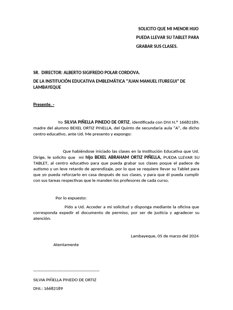 Dirige, le solicito que mi hijo BEXEL ABRAHAM ORTIZ PIÑELLA, PUEDA LLEVAR SU
