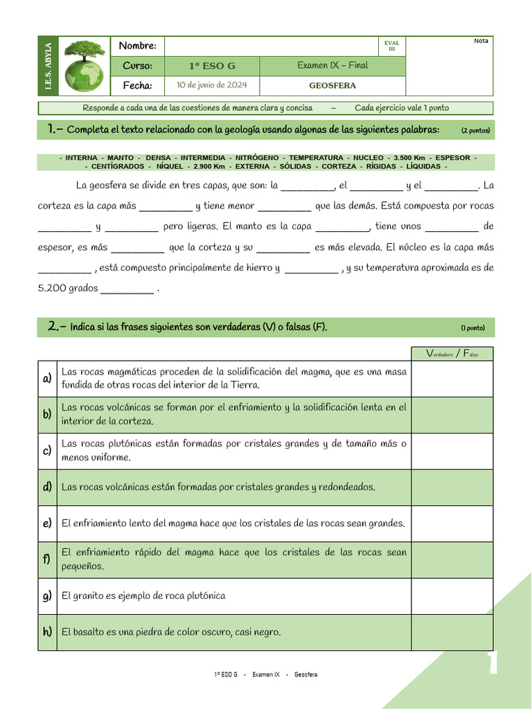 1.- Completa el texto relacionado con la geología usando algunas de las siguientes palabras: (2 puntos)