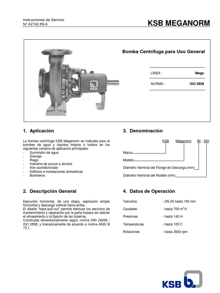 La bomba centrfuga KSB Meganorm es indicada para el bombeo de agua y lquidos limpios o turbios en los siguientes campos de aplicacin principales: Suministro de agua Drenaje Riego Industria de azcar y alcohol Aire acondicionado Edificios e instalaciones domsticas Bomberos