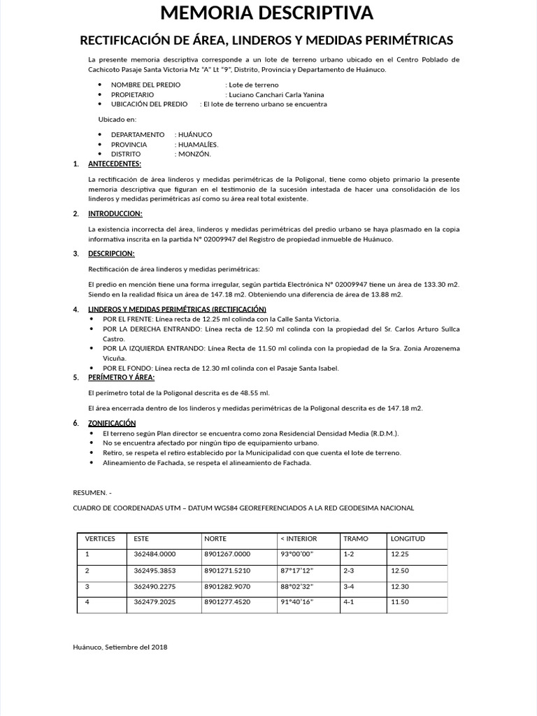 La presente memoria descriptiva corresponde a un lote de terreno urbano ubicado en el Centro Poblado de