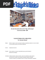 ACCIONES QUE SE DEBE DESARROLLAR: Establecer el REGLAMENTO INTERNO DE LA BIBLIOTECA ESCOLAR de acuerdo a las normas vigentes. Apoyar el desarrollo del programa escolar proporcionando a los maestros, alumnas y comunidad educativa los materiales educativos y de informacin. Ambientar la sala de lectura debidamente adecuado con materiales para incentivar el hbito de lectura y estimular el inters por el estudio y la investigacin. Incentivar al usuario de un modo constante y progresivo en el uso de los recursos y de los servicios de la biblioteca. incorporar a los miembros de la comunidad escolar haciendo de los servicios bibliotecarios un centro de cultura y de formacin e informacin. Organizar Actividades de extensin cultural. Promocionar y desarrollar actividades pro fondos de adquisicin de materiales educativos.