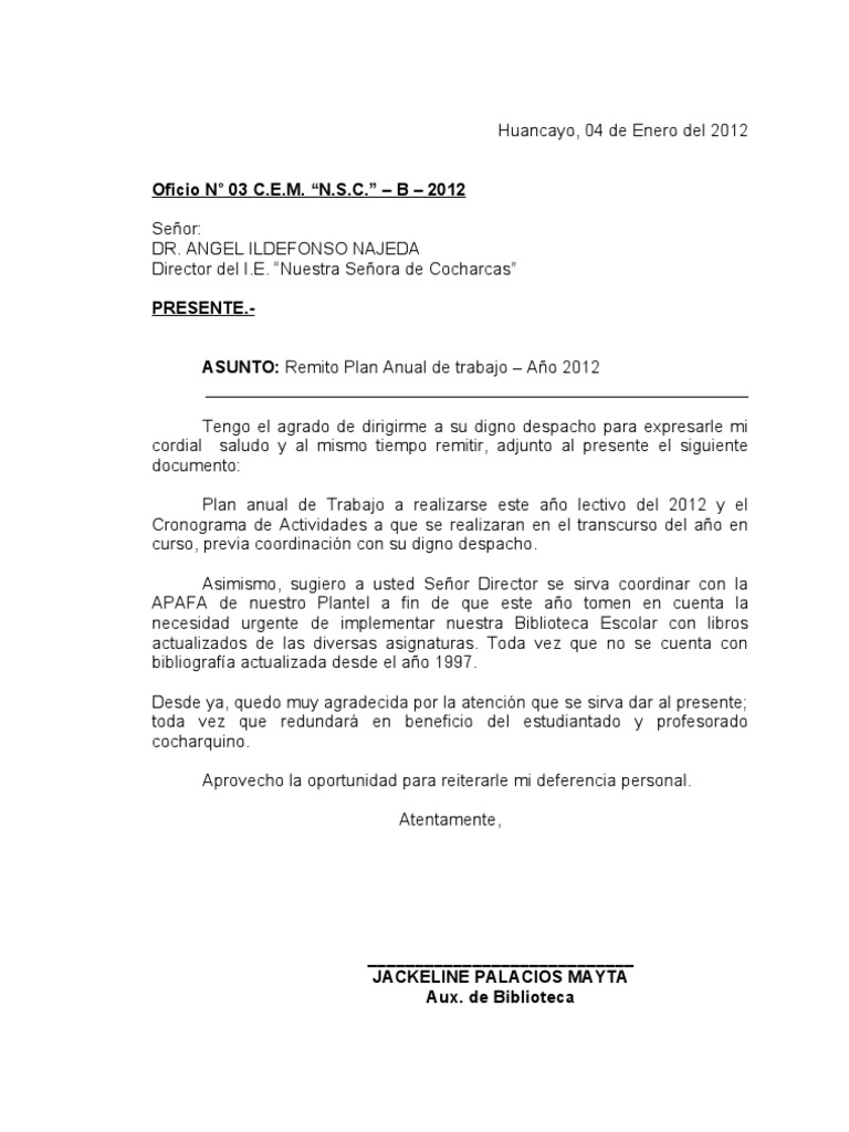 R. ANGEL ILDEFONSO NAJEDA Director del I.E. Nuestra Seora de Cocharcas PRESENTE.ASUNTO: Remito Plan Anual de trabajo Ao 2012 Tengo el agrado de dirigirme a su digno despacho para expresarle mi cordial saludo y al mismo tiempo remitir, adjunto al presente el siguiente documento: Plan anual de Trabajo a realizarse este ao lectivo del 2012 y el Cronograma de Actividades a que se realizaran en el transcurso del ao en curso, previa coordinacin con su digno despacho. Asimismo, sugiero a usted Seor Director se sirva coordinar con la APAFA de nuestro Plantel a fin de que este ao tomen en cuenta la necesidad urgente de implementar nuestra Biblioteca Escolar con libros actualizados de las diversas asignaturas. Toda vez que no se cuenta con bibliografa actualizada desde el ao 1997. Desde ya, quedo muy agradecida por la atencin que se sirva dar al presente; toda vez que redundar en beneficio del estudiantado y profesorado cocharquino. Aprovecho la oportunidad para reiterarle mi deferencia personal. Atentamente,