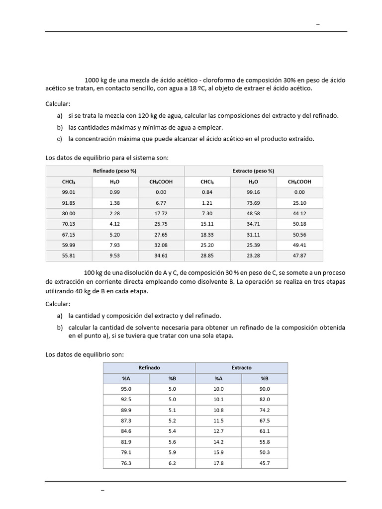 Ejercicio 1. 1000 kg de una mezcla de ácido acético - cloroformo de composición 30% en peso de ácido