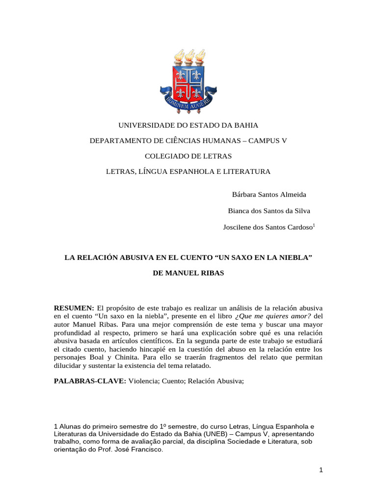 relacionamento abusivo no conto “Un saxo en la niebla”, presente no livro ¿Que me