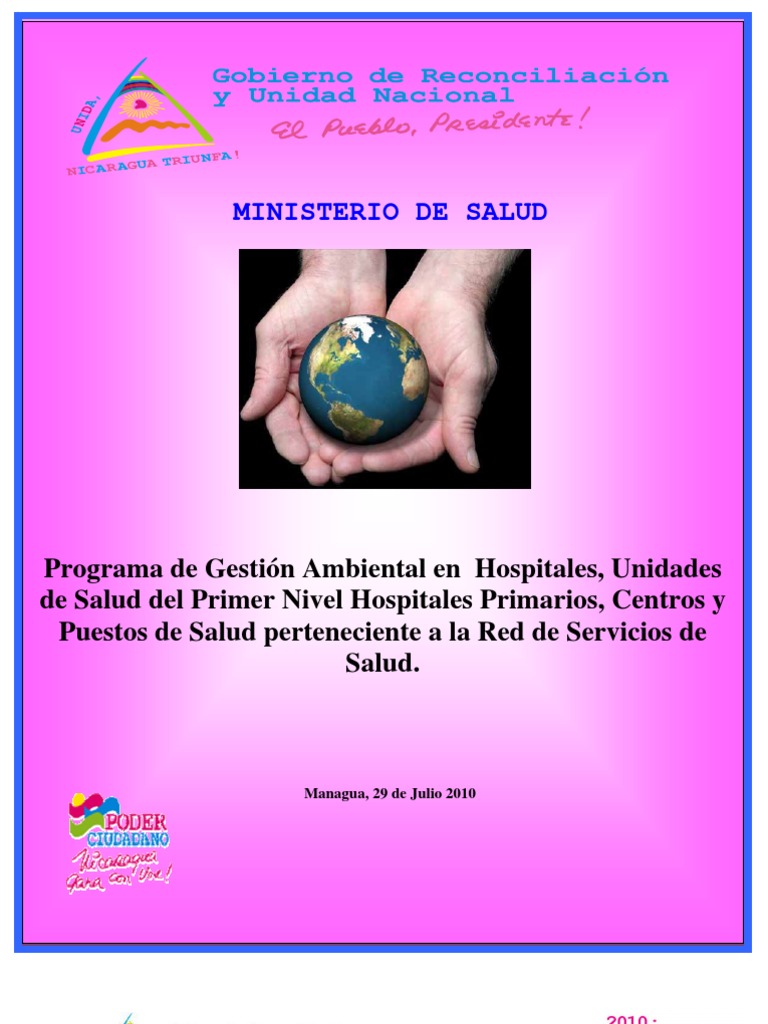 El Ministerio de Salud ha desarrollado los mdulos de capacitacin para el manejo de la higiene y gestin de desechos slidos generados en las unidades de salud. En algunas unidades de primer nivel de atencin, la informacin tcnica disponible son las medidas del control de infecciones, la gua de uso de antispticos y desinfectantes e higiene del lavado de manos. Como parte de los documentos de capacitacin, existen las normativas 020: Organizacin de los Servicios de Salud para el Manejo de la influenza Humana (Fase preparatoria), Organizacin de Servicios ante la Influenza Humana ( Fase de Respuesta y Mitigacin); normativa No. 022: Protocolo de Manejo de Pacientes con Influenza Humana A/H1N1; normativa 023: Norma de Vigilancia Prevencin y control de la Influenza humana A/H1N1, para Centros de trabajo, Centros de Atencin a las personas de la tercera edad, centros escolares y universidades, centros de desarrollo infantil, centros penitenciarios, hoteles, restaurantes y expendios de alimentos. El marco regulatorio institucional, est sustentado en la legislacin sanitaria, ambiental y municipal, que contribuyen al aseguramiento de la reduccin de riesgos sanitarios y aplicacin de mejores prcticas sanitarias ambientales, conforme el cumplimiento de la Ley 217 del Medio Ambiente y Recursos Naturales, Ley 423, Ley General de Salud y su Reglamento Decreto No. 001-2003, Decreto No. 76-2006 del Sistema de Evaluacin Ambiental, Ley 40, Ley de Municipios, Disposiciones Sanitarias, Decreto 394 y Reglamento de Inspeccin Sanitaria, Decreto 432. Norma Tcnica Obligatoria Nicaragense Ambiental para el manejo, tratamiento y disposicin final de los residuos slidos no peligrosos, NTON 05 014-01. Norma tcnica Obligatoria Nicaragense Ambiental, para el manejo, tratamiento y eliminacin de Residuos Slidos Peligrosos, NTON 05 015-01. Reglamento Sanitario de los Desechos Slidos Peligrosos y No Peligrosos. Resolucin Ministerial No. 122-2008, Ministerio de Salud. El plan de accin a desarrollarse responder al desarrollo de una prctica sanitaria y ambiental como parte de la mejora continua de las prcticas de higiene, seguridad ocupacional, bioseguridad en el ciclo de la atencin de salud, gestin del manejo de residuos slidos y lquidos, desde la fuente generadora hasta la disposicin final co-gestionada con la municipalidad asegurando en el ciclo las prcticas de produccin ms limpia y la valoracin de medidas de mitigacin para la minimizacin de impactos ambientales y de la salud. El plan de accin1 integrar actividades del plan de gestin ambiental en unidades de salud del Primero y Segundo Nivel de Atencin; se har uso de: i) los materiales de capacitacin para la gestin y manejo de desechos slidos hospitalarios, manuales para inspectores sanitarios, personal mdico y de enfermera, para la gestin y manejo de los desechos