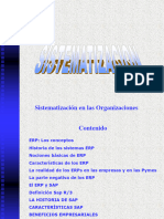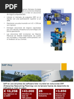 Historia SAP, (Systems, Applications, Products in Data Processing) Sistemas, Aplicaciones y Productos para el Procesamiento de Datos, es el proveedor de software estndar para negocios lder en el mercado. EL nombre SAP es al mismo tiempo el nombre de una empresa y el de un sistema informtico. SAP fue fundada el 1 de Abril 1972 por cinco personas: Wellenreuther, Hopp, Hector, Plattner y Tschira. Mientras que estaban empleados en la IBM, haban desarrollado un paquete de contabilidad financiera que funcionaba en bloques para un cliente de IBM (Naturin). SAP compr los derechos a Naturin y empez con el diseo y aplicacin de un sistema financiero a tiempo real como un paquete bsico sobres las experiencias que se tena en el programa. Vendieron la primera copia del sistema bsico a ICI por el mismo precio que a los ltimos clientes. Simultneamente, desarrollaron un sistema de administracin de materiales, como software a la medida para ICI, pero se reservaron los derechos de propiedad para SAP. Con el dinero obtenido financiaron el desarrollo del sistema financiero contable. Posteriormente el sistema de administracin de materiales se convirti en un paquete estndar, que se financi con los beneficios del sistema financiero contable. Los dos sistemas desarrollados fueron los primeros mdulos de los que se llamo el sistema R, que solo ms tarde, pstumamente se renombr R/1 para distinguirlo mejor de sus sucesores R/2 y R/3. En la actualidad, SAP emplea a 27.800 empleados en 50 pases. En estos momentos est siendo utilizado en ms de 30.000 instalaciones por ms de 10 millones de usuarios y en aproximadamente la mitad de las 500 ms grandes compaas del mundo. Actualmente tiene dos filiales SAP Markets, empresa que se dedica a crear mercados business to business, y SAP Hostings cuya actividad empresarial se centra en proveedor de servicios de Internet y proveedor de servidores de aplicaciones. En la actualidad SAP ofrece software de gestin empresarial que cubre todas las necesidades de las empresas en prcticamente todos los sectores. Existen 22 soluciones sectoriales. Algunos de sus productos son: SAP R/3: su producto estrella. Es el ms utilizado ya que es el que ms tiempo lleva en el mercado, el resto de productos llevan en el mercado algo ms de dos aos. Aplicaciones lanzadas hace algo ms de dos aos: Customer Relationship Management CRM, Supply Chain Management APO, Product Life Cycle Management, Knowledge Management, Business Information Warehouse BIW, Strategic Enterprise Management SCM, mySAP E-Commerce solutions, mySAP Financials, mySAP.com marketplace, mySAP.com workplace.