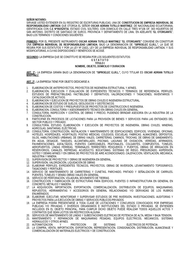 ART. 1º.- LA EMPRESA GIRARA BAJO LA DENOMINACION DE “SIPROELEC E.I.R.L.”, CUYO TITULAR ES OSCAR ADRIAN TUTILLO