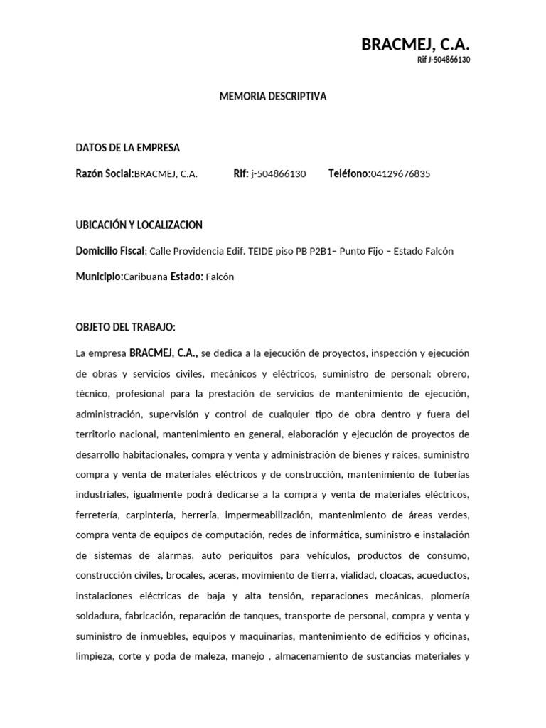 Razón Social:BRACMEJ, C.A. Rif: j-504866130 Teléfono:04129676835
