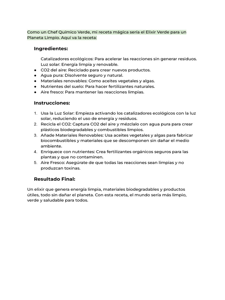 Como un Chef Químico Verde, mi receta mágica sería el Elixir Verde para un