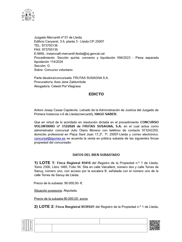 Primera Instancia n.6 de Lleida(mercantil), HAGO SABER: