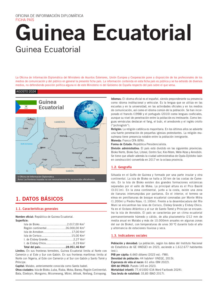 Capital: Malabo, anteriormente conocida como Santa Isabel. IDH del PNUD: Puesto 145 en 2023.