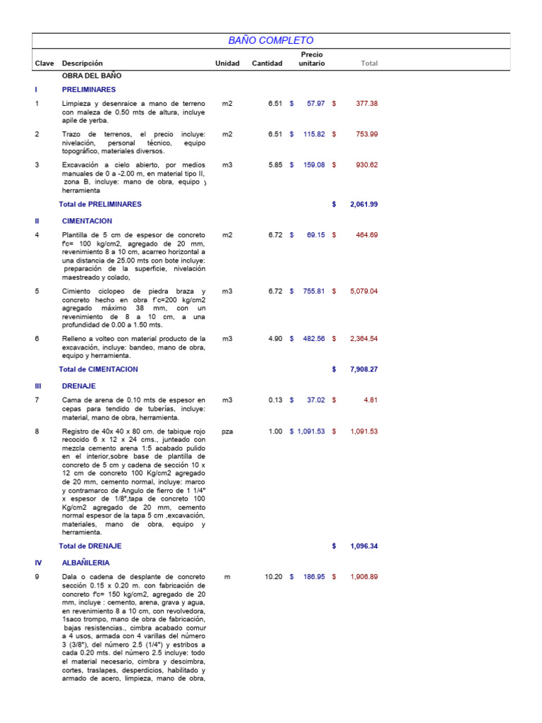 10 Muro de tabique rojo recocido 6 x 12 x 24 m2 13.96 $ 115.26 $ 1,609.03