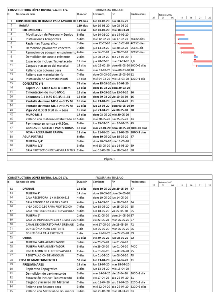 1 CONSTRUCCION DE RAMPA PARA LAVADO DE 119 días lun 10-02-20 lun 08-06-20