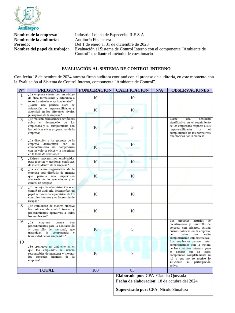 calificación de 85/100, lo que representa un 85% de confianza en el sistema de control interno y un riesgo bajo del