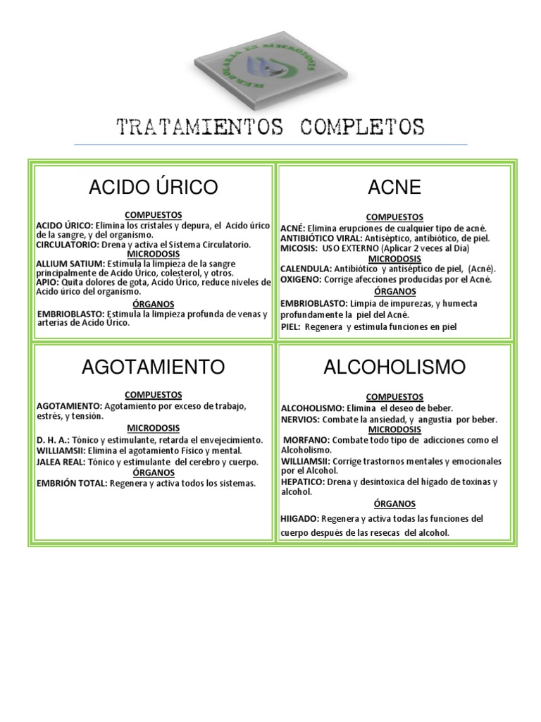COMPUESTOS PAO: Elimina el pao (manchas en la cara). HEPTICO: Drena el hgado y elimina toxinas. URINARIO: Drena vas urinarias y limpia riones. MICRODOSIS ZARZAPARRILLA: Cuando la causa se hormonal. RGANOS PIEL: Regenerador de las clulas de la piel y elimina algunos trastornos como el pao. EMBRIOBLASTO: Limpia de impurezas la piel, pao.