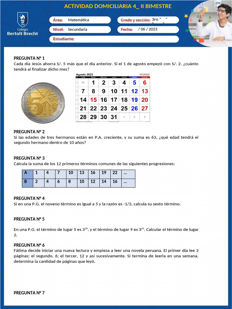 Cada día Jesús ahorra S/. 5 más que el día anterior. Si el 1 de agosto empezó con S/. 2. ¿cuánto
