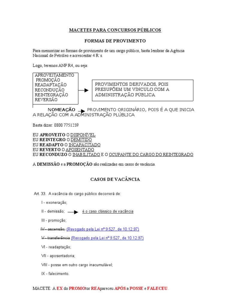 Para memorizar as formas de provimento de um cargo pblico, basta lembrar da Agncia Nacional de Petrleo e acrescentar 4 Rs. Logo, teremos ANP R4, ou seja: APROVEITAMENTO PROMOO READAPTAO RECONDUO REINTEGRAO REVERSO