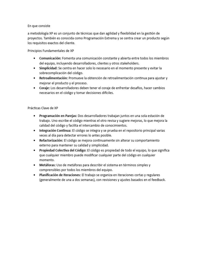 En resumen, XP es una metodología que busca maximizar la calidad del software y la satisfacción