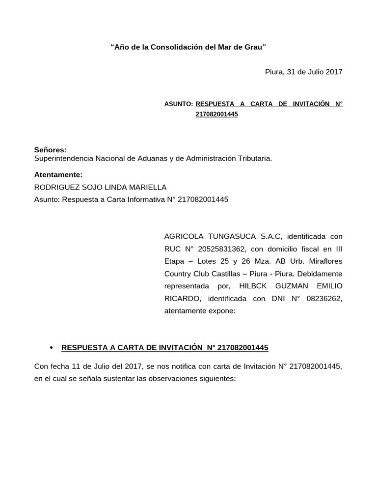 RESPUESTA A CARTA DE INVITACIÓN N° 217082001445