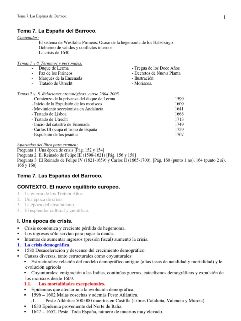 Contenidos: - El sistema de Westfalia-Pirineos: Ocaso de la hegemonía de los Habsburgo - Gobierno de validos y conflictos internos. - La crisis de 1640.