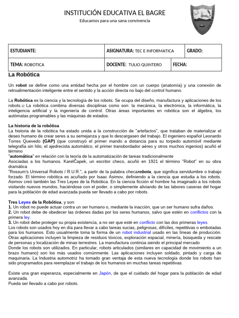 TEMA: ROBOTICA DOCENTE: TULIO QUINTERO FECHA: