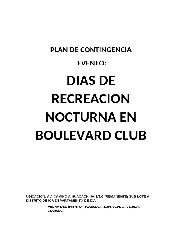 BOULEVARD CLUB, éste Plan de contingencia será aplicado en casos de sismos, alteraciones de orden