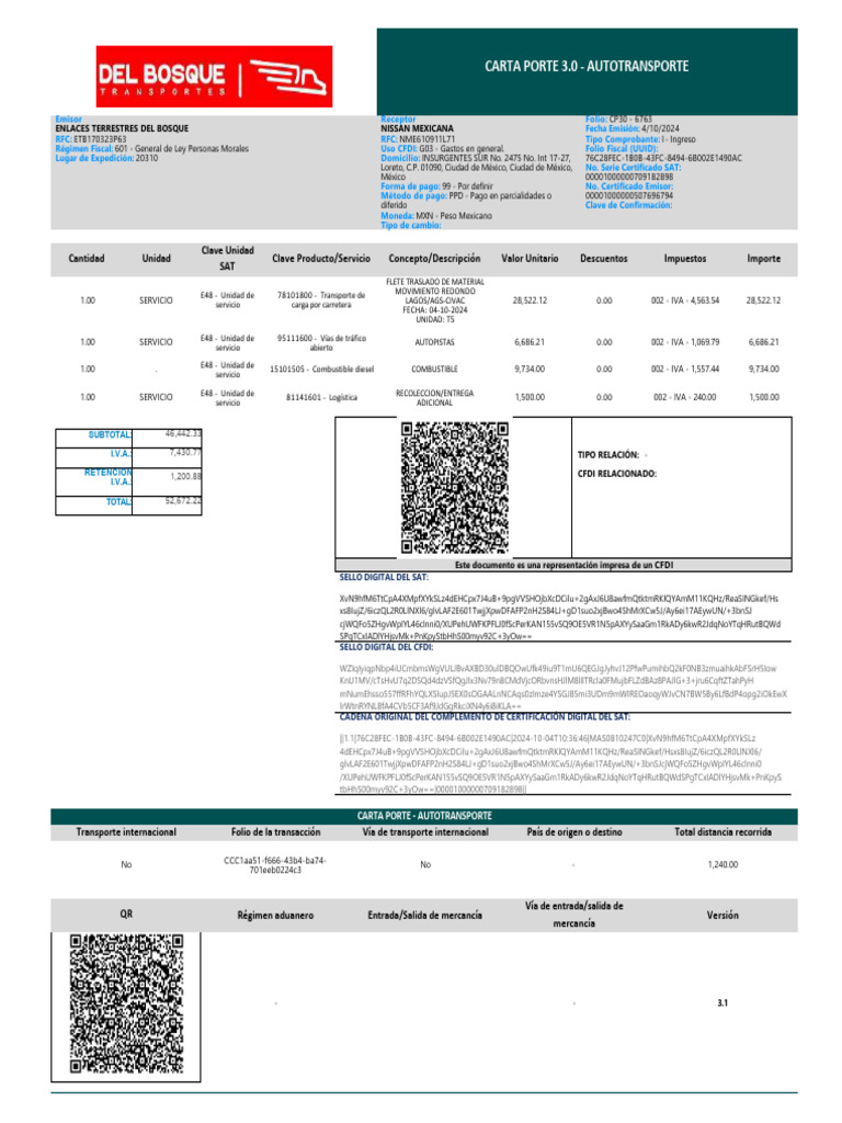 ENLACES TERRESTRES DEL BOSQUE NISSAN MEXICANA Fecha Emisión: 4/10/2024