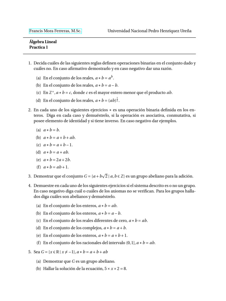 1. Decida cuáles de las siguientes reglas definen operaciones binarias en el conjunto dado y
