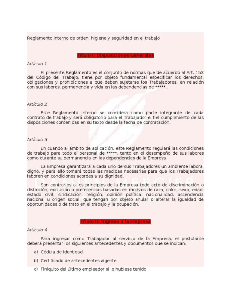 Ttulo I: Disposiciones Generales Artculo 1 El presente Reglamento es el conjunto de normas que de acuerdo al Art. 153 del Cdigo del Trabajo, tiene por objeto fundamental especificar los derechos, obligaciones y prohibiciones a que deben sujetarse los Trabajadores, en relacin con sus labores, permanencia y vida en las dependencias de *****.