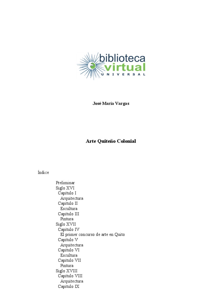 ndice Preliminar Siglo XVI Captulo I Arquitectura Captulo II Escultura Captulo III Pintura Siglo XVII Captulo IV El primer concurso de arte en Quito Captulo V Arquitectura Captulo VI Escultura Captulo VII Pintura Siglo XVIII Captulo VIII Arquitectura Captulo IX