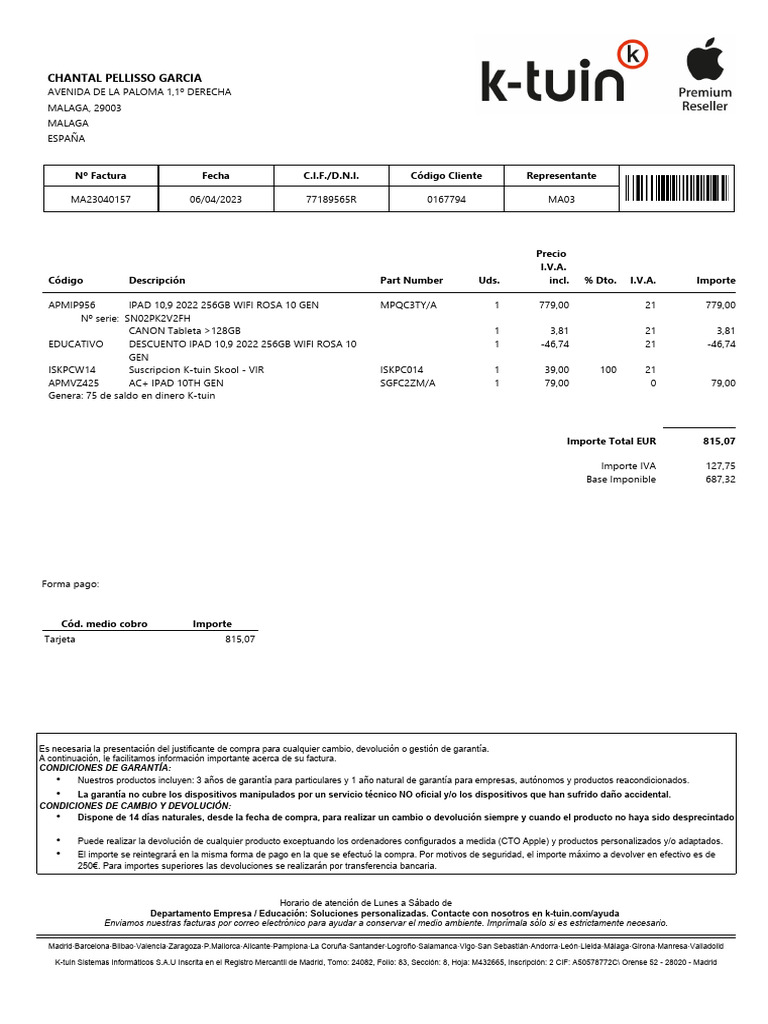 • Nuestros productos incluyen: 3 años de garantía para particulares y 1 año natural de garantía para empresas, autónomos y productos reacondicionados.