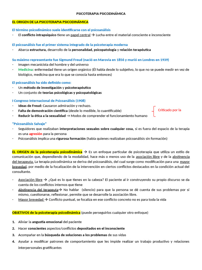 del terapeuta. La terapia psicodinámica se deriva del psicoanálisis, del cual surge como modificación para una mayor