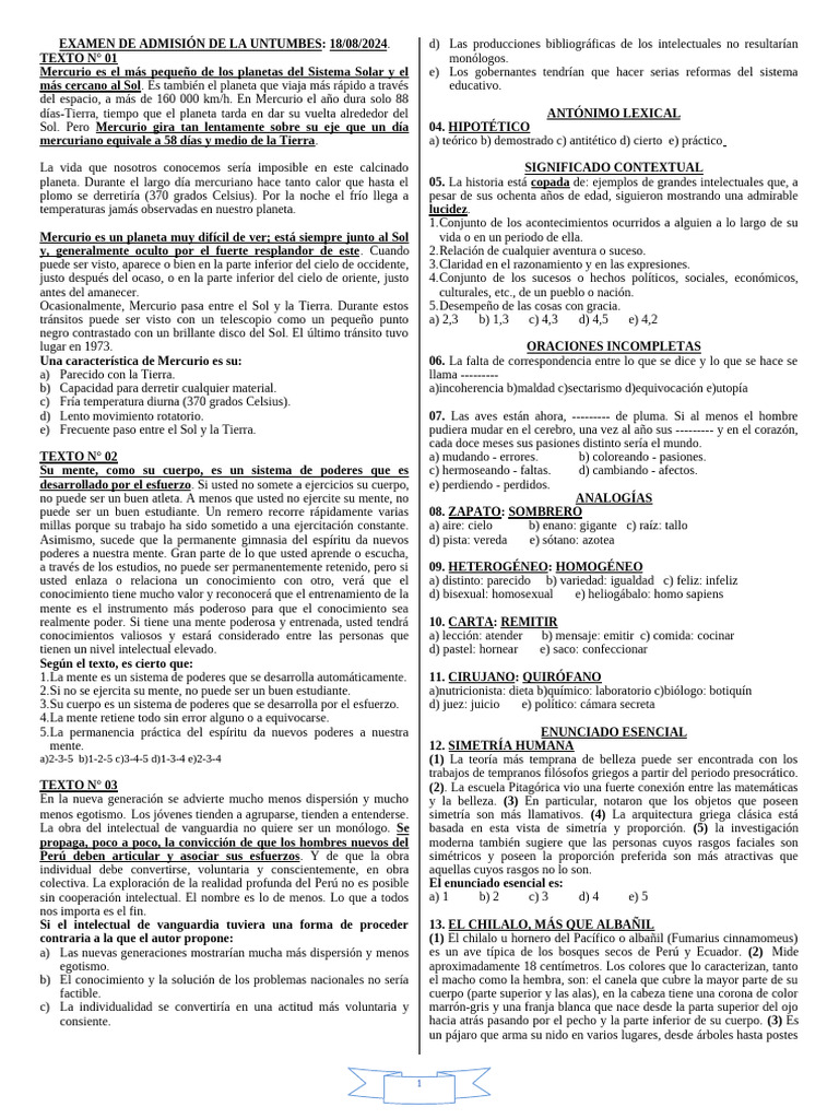 15. INGLATERRA EXAMEN DE ADMISIÓN DE LA UNTUMBES: MEDICINA
