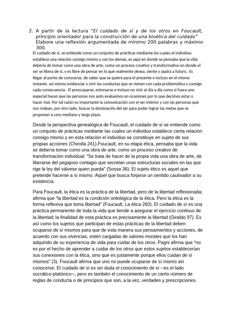A partir de la lectura “El cuidado de sí y de los otros en Foucault,