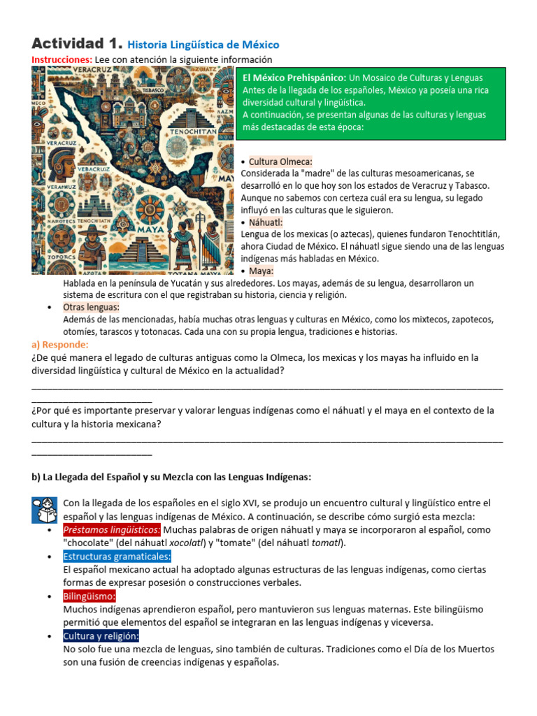 Instrucciones: En esta actividad investigarás aspectos detallados sobre la historia lingüística de México y la influencia del