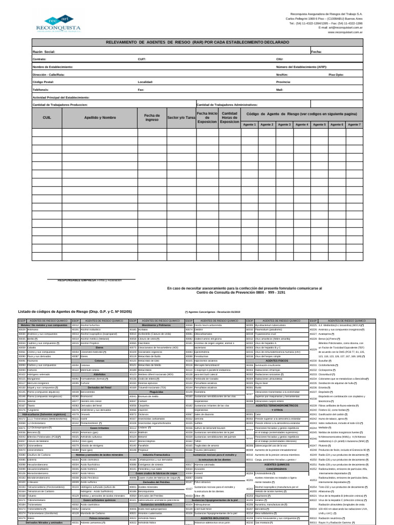 Listado de códigos de Agentes de Riesgo (Disp. G.P. y C. Nº 002/05) (*) Agentes Cancerígenos - Resolución 81/2019